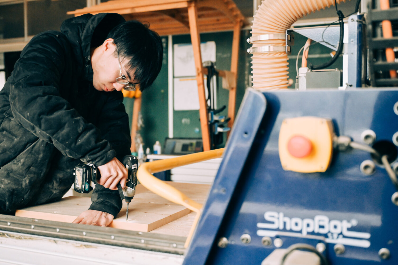 - まず、就職先を考える中で、デジタルテクノロジーを活用して家具から建築までを作る建築系スタートアップ企業「VUILD株式会社」と出会い、インターンを始めたんです。VUILDは松川町と包括的地域連携協定を結んでおり、ShopBotを活用し地域木材を使ってものづくりをするプロジェクトを行っていました。社員の方から「誰か松川町のインターンに興味ある人知らない?」と声をかけられ、自分が手を挙げたんです。松川町のことは何も知りませんでしたが、木材が作られる過程に興味があって。