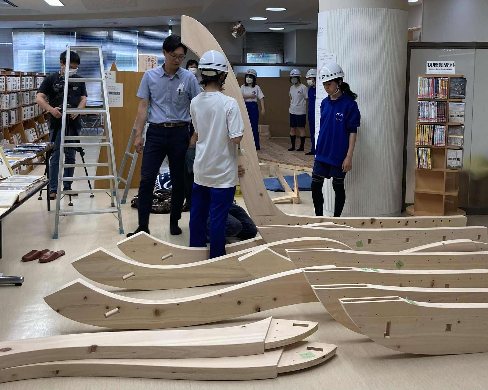 - 加工したパーツをうまく組み合わせれば、いろんなものが作れます。松川町図書館をリニューアルするプロジェクトでは、スタッフの方から、「使われなくなったビデオコーナーに何か作ってくれないか」と声をかけていただき、町で豊富に採れるヒノキを使用してアーチ状の本棚を作りました。